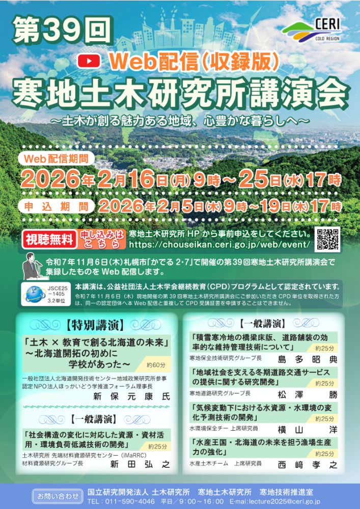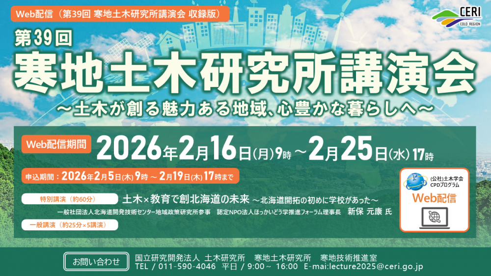 本プログラムでは、令和7年11月6日(木)かでる2.7で開催の第39回寒地土木研究所講演会で収録した映像をWeb配信します。